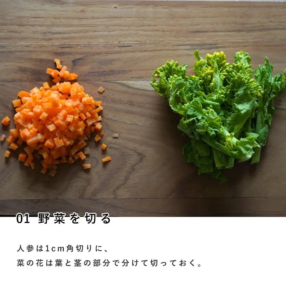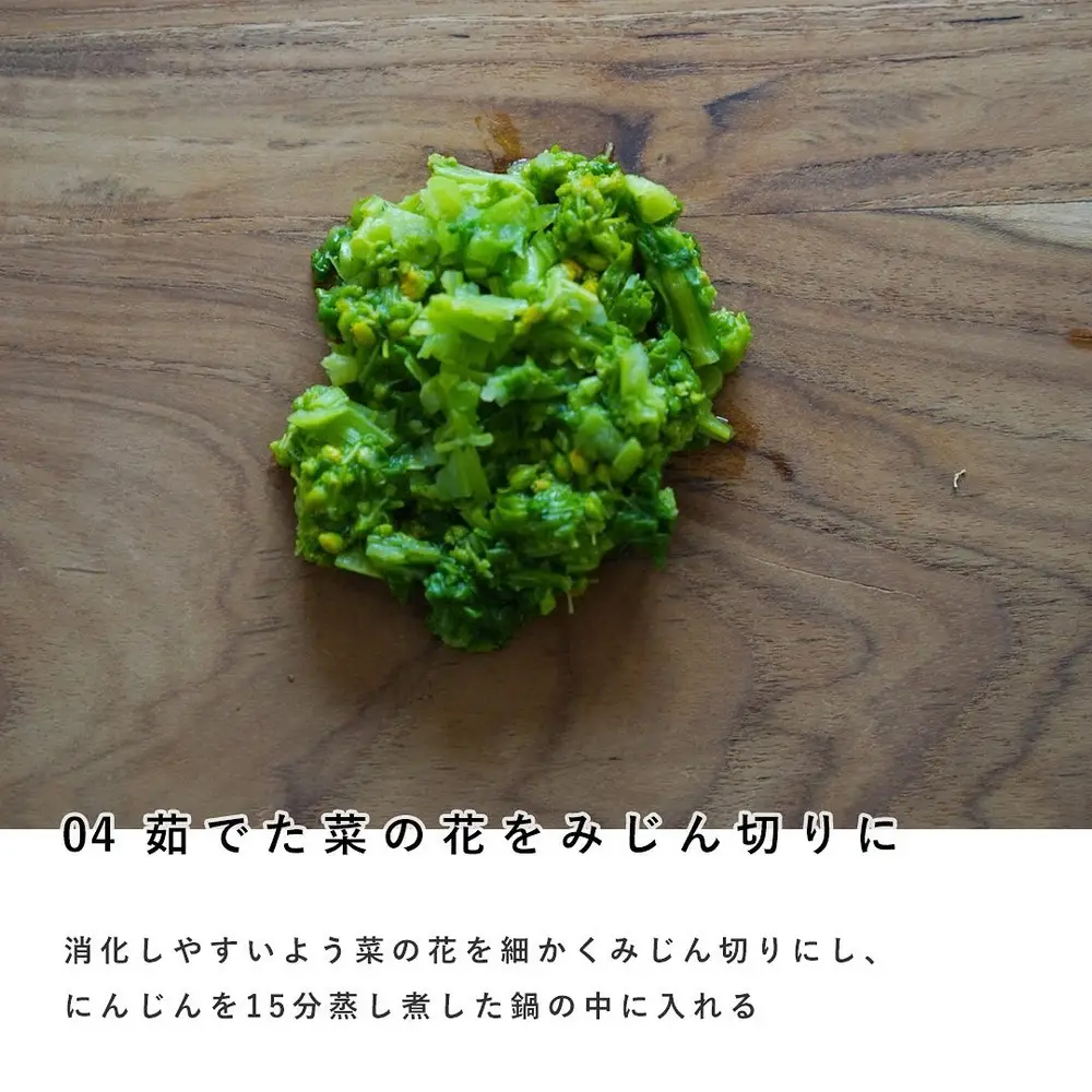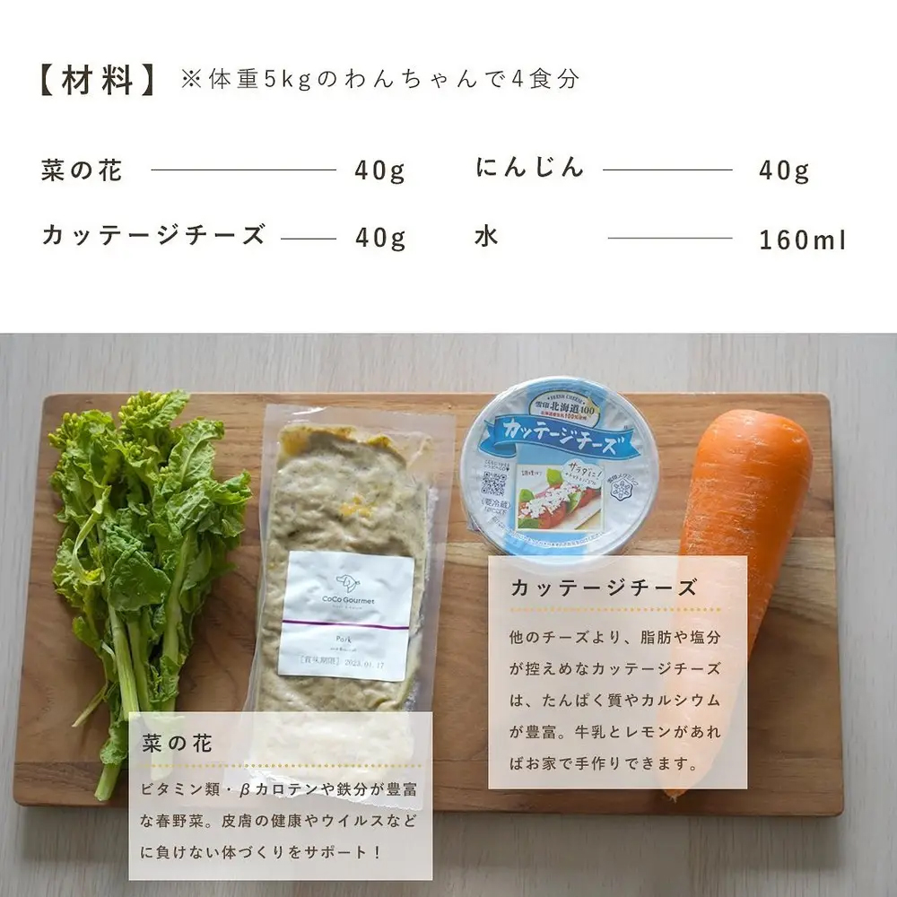 そんな愛犬家の方のために、旬の菜の花や栄養たっぷりのにんじんわんちゃんが大好きなカッテージチーズを使った春におすすめのアレンジレシピ「菜の花とチーズのココグルメリゾット」をご用意しました。