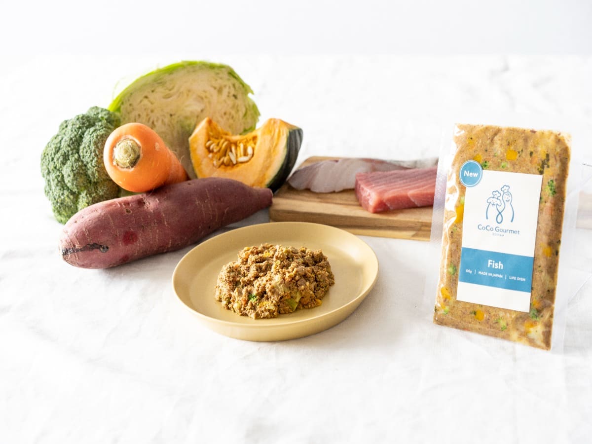 ココグルメの『フィッシュ&パンプキン』メニューには、上記でご紹介したメインの食材の他にさつまいも、かぼちゃ、にんじん、キャベツ、ごま、殺菌乳酸菌、粉末昆布に加え、栄養添加物としてミネラル類、ビタミン類が含まれています。