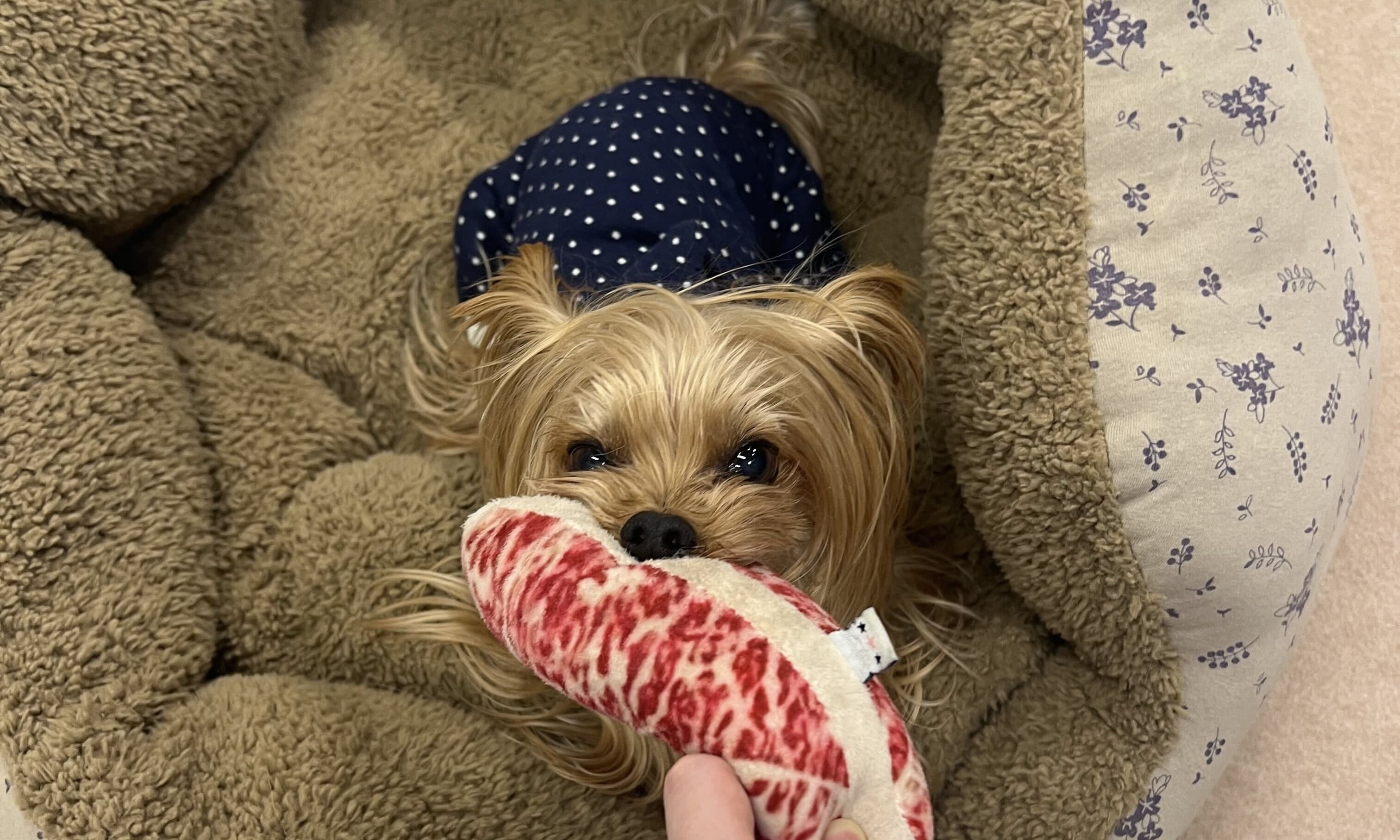 おもちゃ遊びが大好きで、おもちゃを投げたら、すごく喜んでキャッチしに行くのに、咥えたおもちゃをなかなか離してくれません(笑)