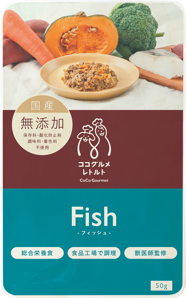 とびうお、さつまいも、かぼちゃ、あじ、キャベツ、真鯛、大根、ココナッツクリーム、乾燥ビール酵母、フラクトオリゴ糖、かつお節粉、ごま、食用なたね油、ゼラチン、粉寒天、クリルオイル(オキアミ抽出物)、殺菌乳酸菌、粉末昆布、フィッシュペプチド /ミネラル類(Ca、Cl、Na、P、Zn、Fe、Cu、Mn)、ビタミン類(C、ナイアシン、E、パントテン酸、B2、B1、B6、A、葉酸、D、B12)