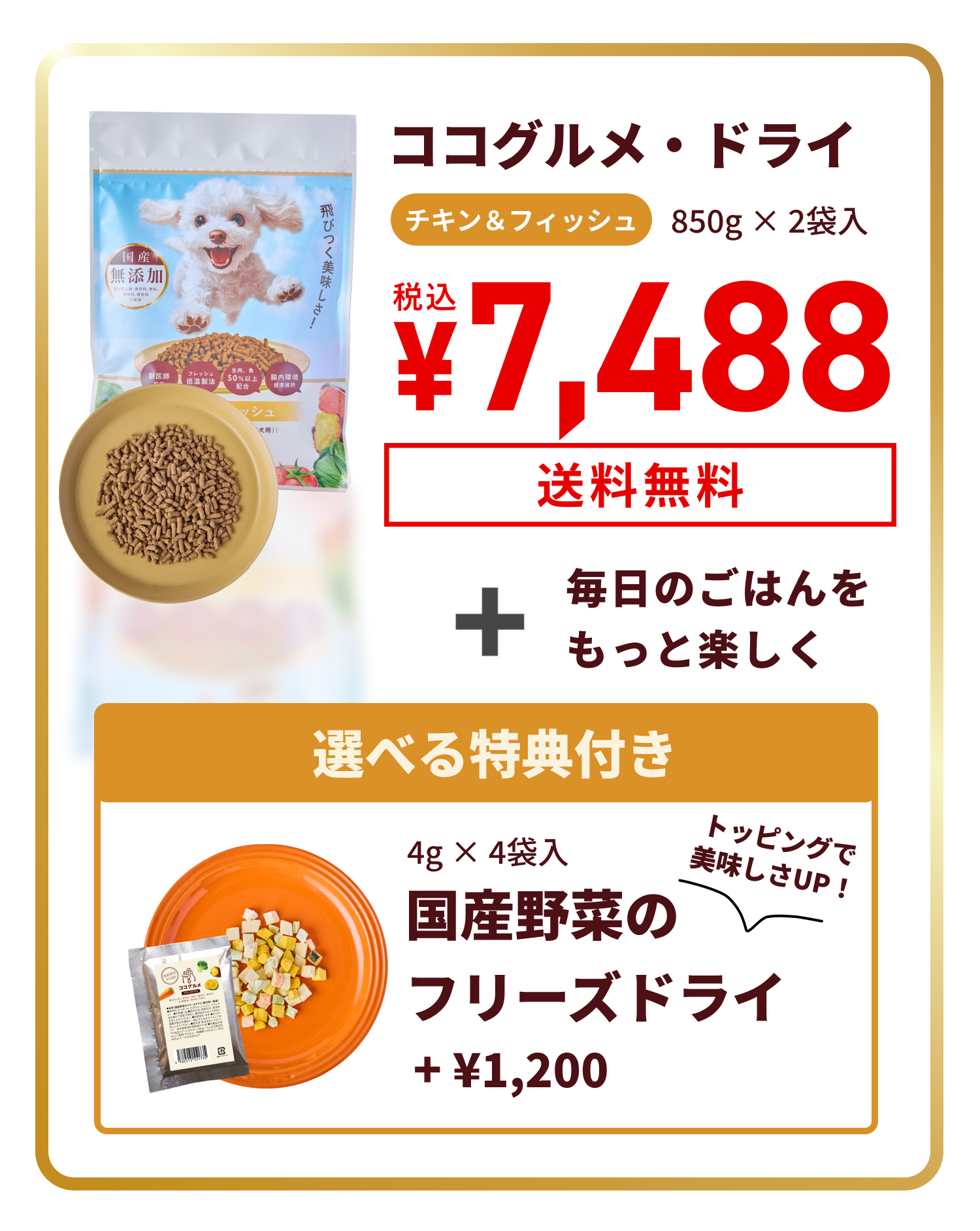 返金保証制度の対象は、ココグルメ公式サイトにてココグルメを初めて購入された商品(1住所ごとの初回配送)分のみに限ります。