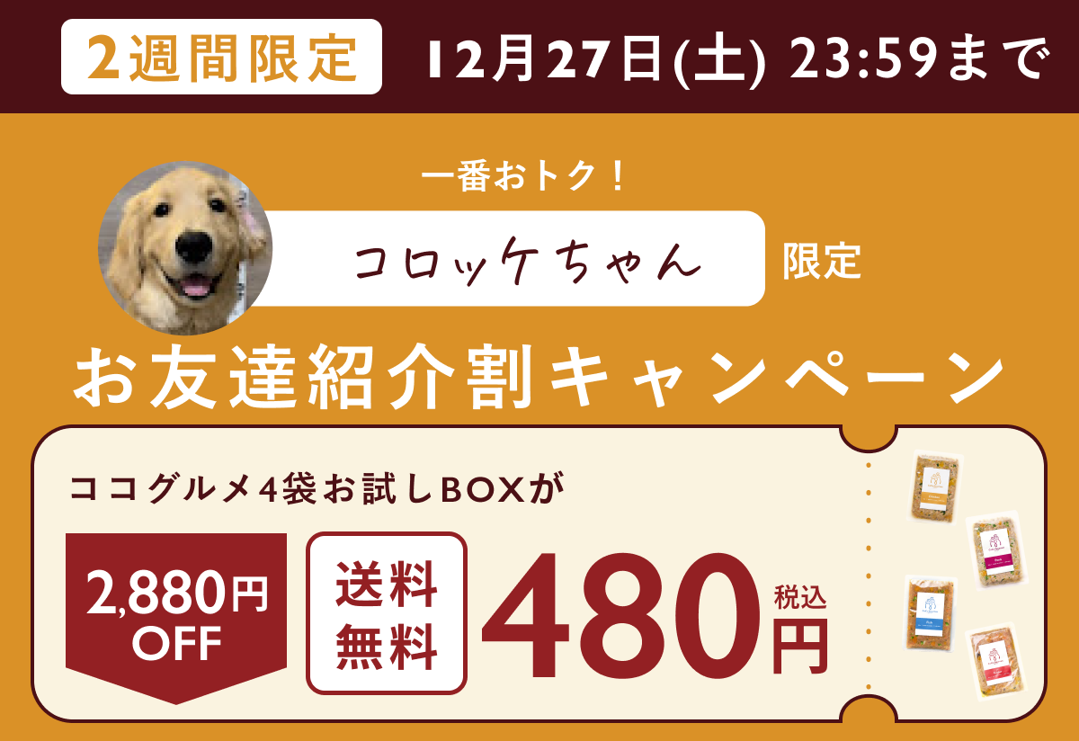 お友達キャンペーンの有効期限が切れました。 なお、ココグルメを始めてご注文される方は下記の注文フォームより980円でご注文いただけます。 この機会にぜひご利用ください。