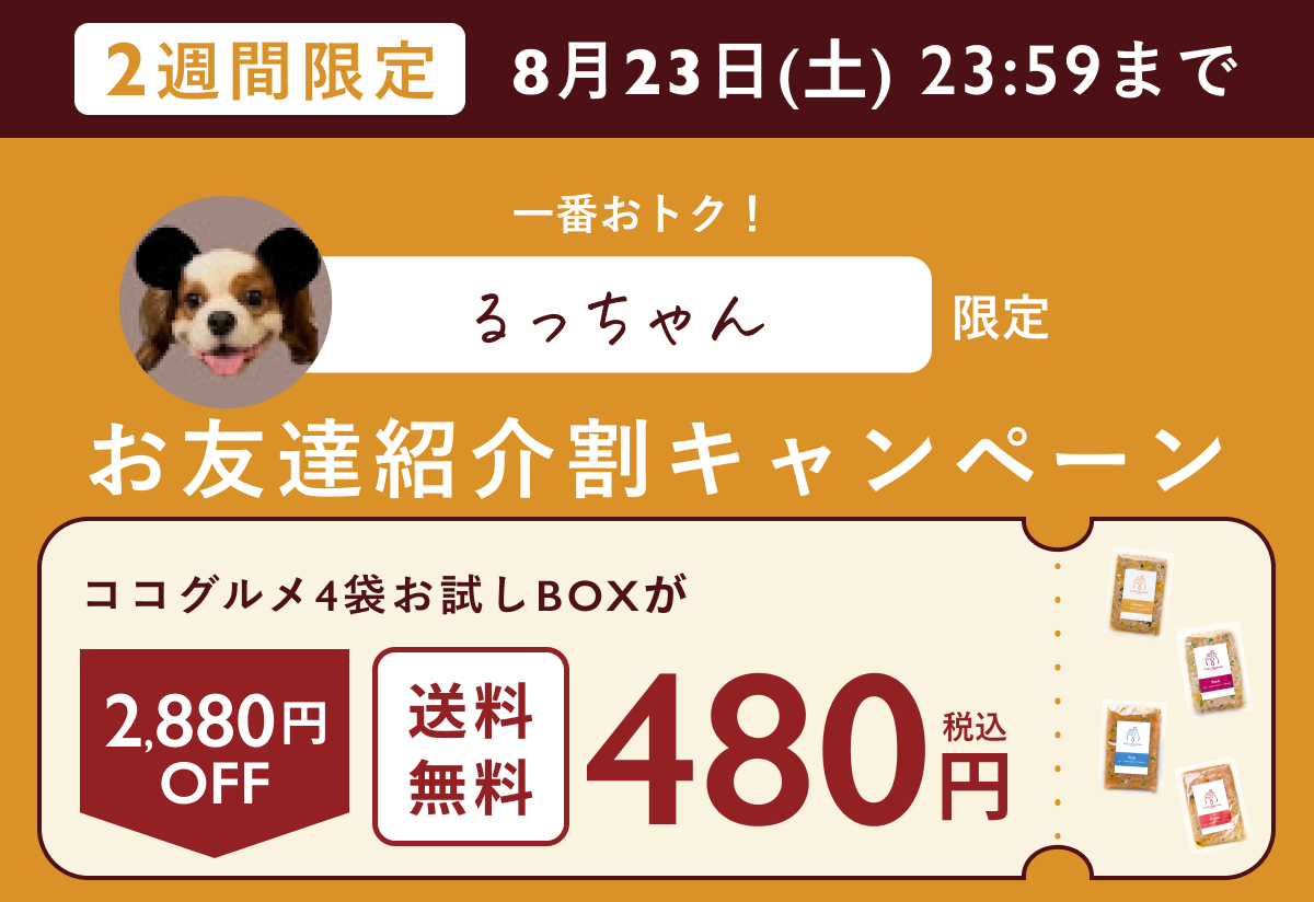 お友達キャンペーンの有効期限が切れました。 なお、ココグルメを始めてご注文される方は下記の注文フォームより980円でご注文いただけます。 この機会にぜひご利用ください。