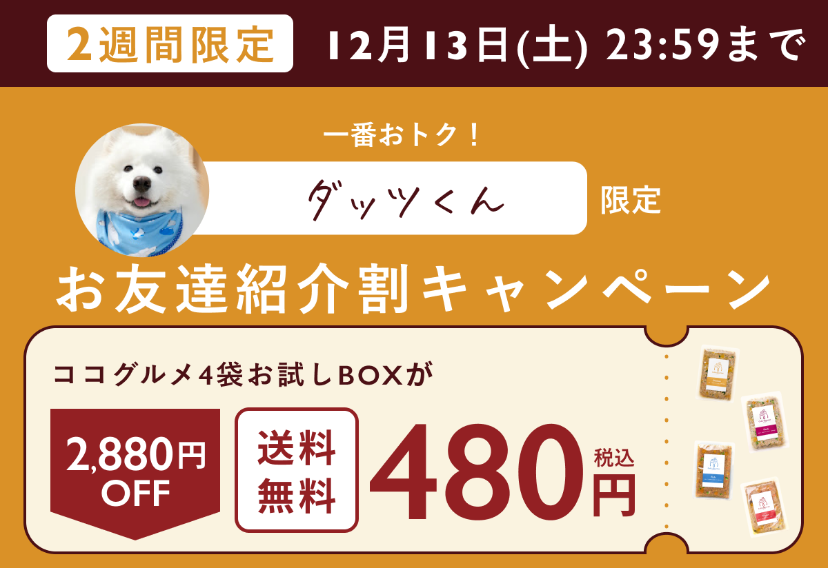 お友達キャンペーンの有効期限が切れました。 なお、ココグルメを始めてご注文される方は下記の注文フォームより980円でご注文いただけます。 この機会にぜひご利用ください。