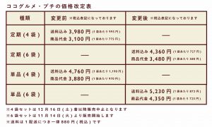 この度、お寄せいただいたお客さまのお声をもとに、ココグルメ・プチのメニューが4種類に増え、さらに、1袋あたりの価格を改定(値下げ)します。