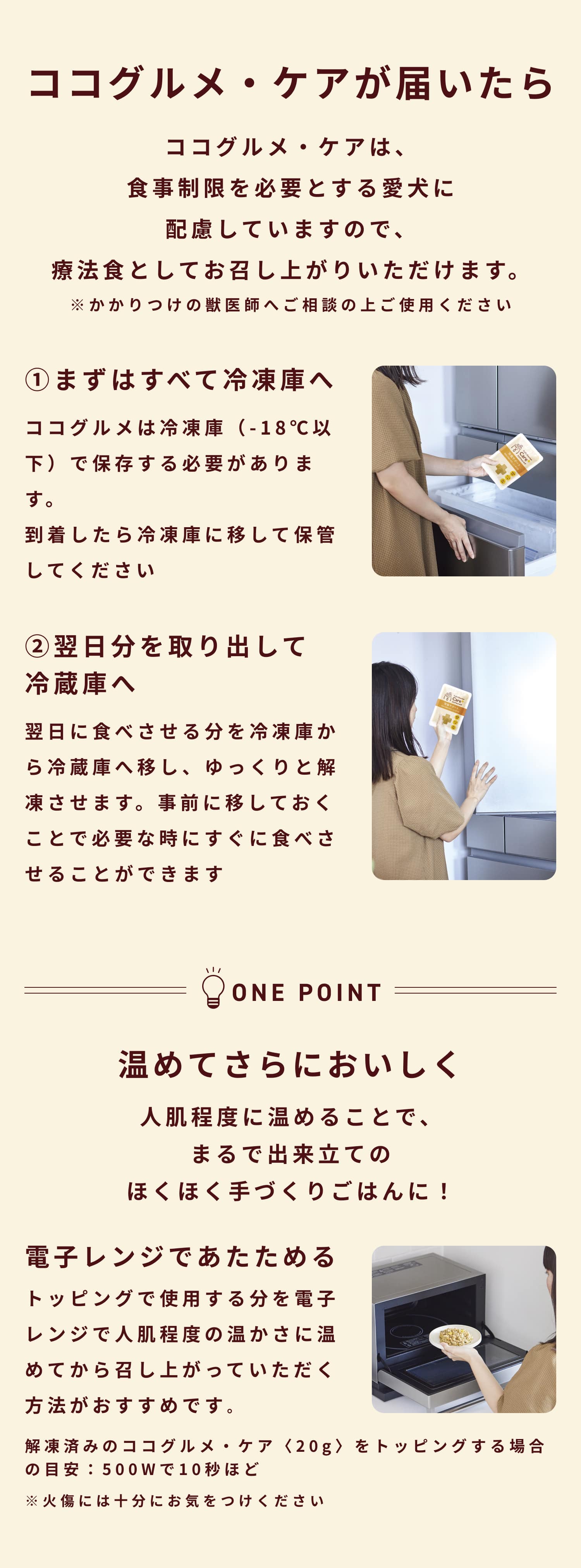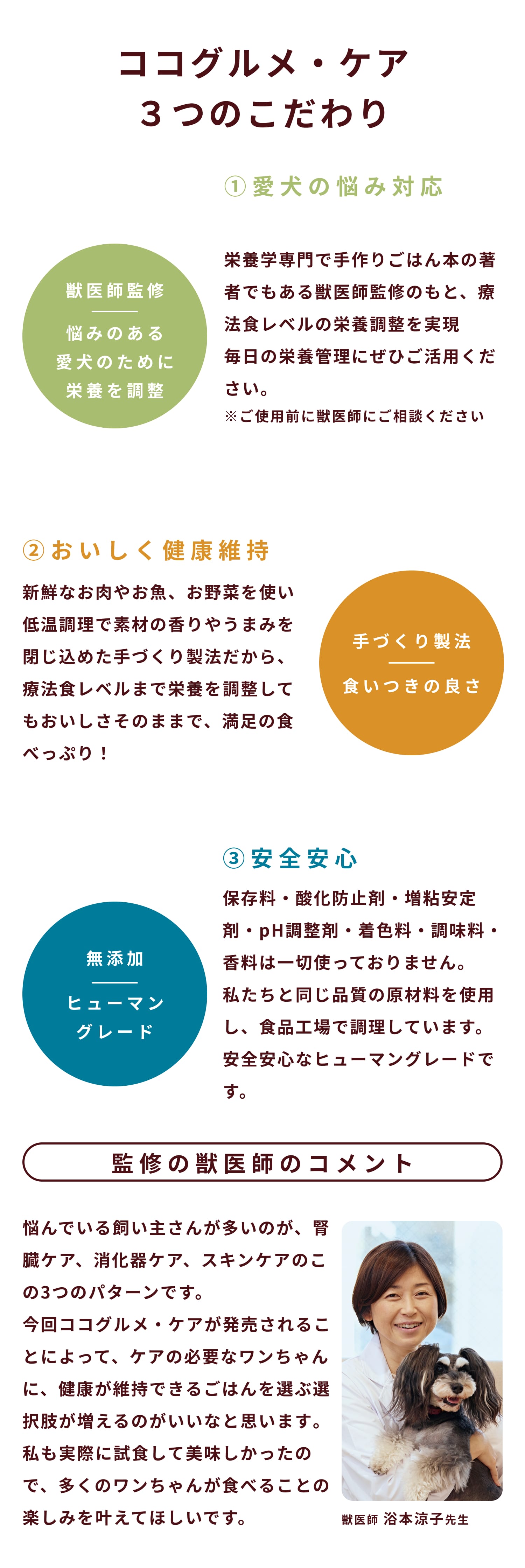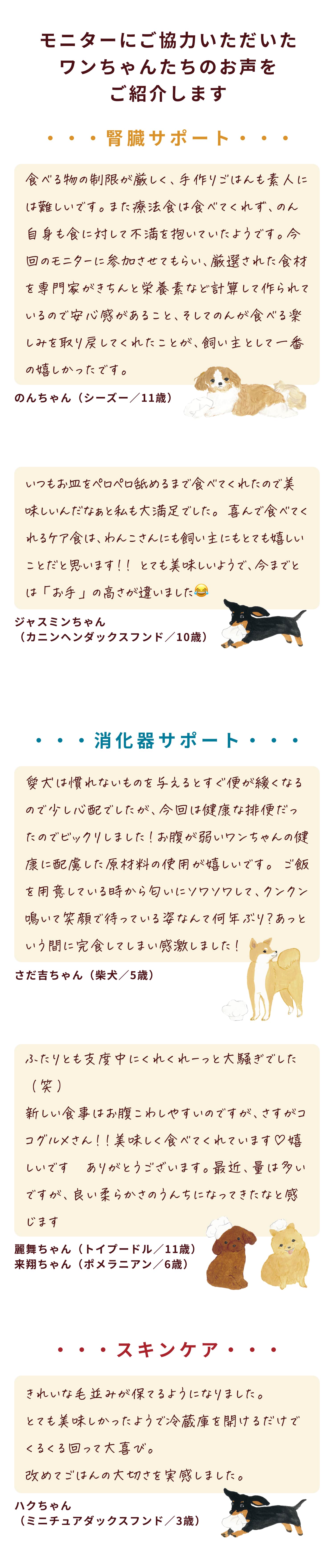 鶏肉(皮付きむね肉、レバー、ハツ)、かぼちゃ、にんじん、キャベツ、さつまいも、サーモン、米粉、ココナッツクリーム、甘酒(米、米麹)、ケール、粉寒天、ごま、食用なたね油、真鯛オイル、クリルオイル(オキアミ抽出物)、殺菌乳酸菌、ブルーベリー葉粉末、粉末昆布/ミネラル類(Ca、Zn、Cu、Fe、P、Mn)、ビタミン類(C、ナイアシン、E、パントテン酸、B2、B1、B6、A、葉酸、D、B12)
